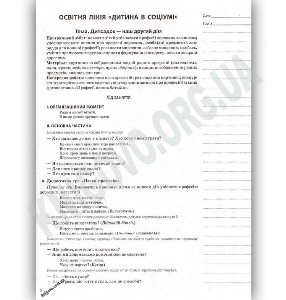 Посібник містить орієнтовні конспекти занять з дітьми 5-го року життя. Конспекти занять складено на навчальний рік за порами року Осінь відповідно до вимог Базового компонента дошкільної освіти та завдань оновленої програми розвитку дитини дошкільного віку Українське дошкілля. Задля зручності використання всі розробки розміщено на окремих аркушах. Поля для записів дадуть змогу творчому вихователеві, користуючись запропонованим у посібнику матеріалом, скласти власні конспекти занять.