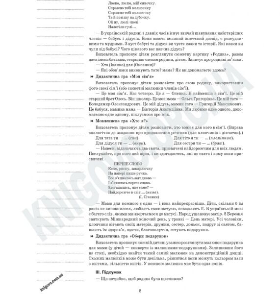 Посібник містить орієнтовні конспекти занять з дітьми 6-го року життя, що реалізують завдання пізнавального, художньо-естетичного та мовленнєвого розвитку. Конспекти занять складено за блочно-тематичним принципом планування на навчальний рік, розроблено відповідно до вимог та завдань Базового компонента дошкільної освіти, чинних освітніх програм. Задля зручності використання всі розробки розміщено на відривних аркушах. Поля для записів дадуть змогу творчому вихователеві, користуючись запропонованим у посібнику матеріалом, скласти власні конспекти занять.