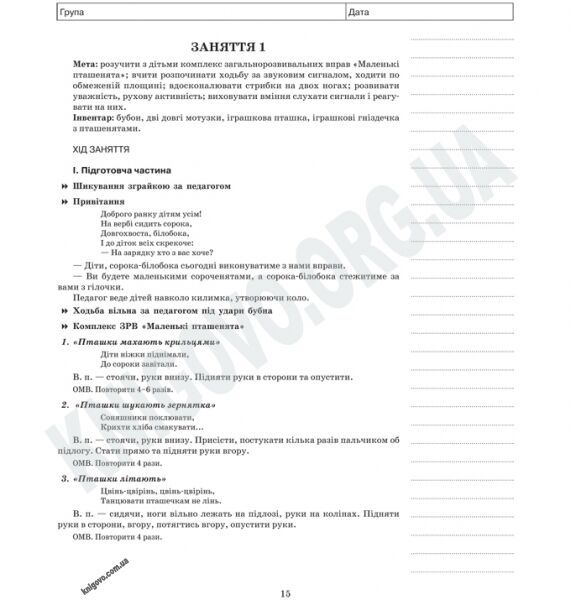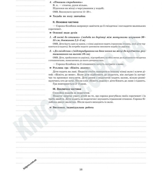 Посібник містить орієнтовне календарне та тематичне планування на навчальний рік, орієнтовні конспекти занять з дітьми 3-го року життя, що реалізують завдання фізичного розвитку. Конспекти занять розроблено відповідно до вимог та завдань Базового компонента дошкільної освіти, чинних освітніх програм. Задля зручності використання всі розробки розміщено на відривних аркушах. Поля для записів дадуть змогу творчому педагогові, користуючись запропонованим у посібнику матеріалом, скласти власні конспекти занять. Переглянути...