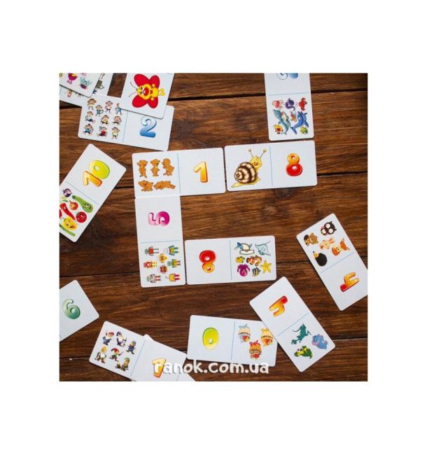 Навчальне доміно Лічба 36 карток ЗДО НУШ. Кожна картка, як і в звичайному доміно, розділена на дві частини. Ліворуч намальовано декілька предметів, а праворуч цифра. У свій хід гравець повинен або приставити до цифри картку з відповідною кількістю предметів, або до картинки картку з цифрою, що означає кількість предметів на ній.