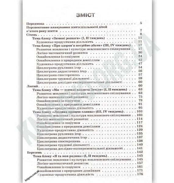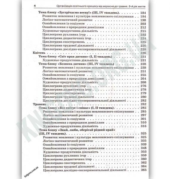 Посібник містить орієнтовне планування організації життєдіяльності дітей п’ятого року життя Частина 2 за блочно-тематичним принципом. Наведено перспективне планування на весь навчальний рік та планування занять за такими освітніми лініями: Дитина в соціумі, Розвиток мовлення і культура мовленнєвого спілкування, Логіко-математичний розвиток, Ознайомлення з природним довкіллям, Художньопродуктивна діяльність. Також уміщено циклограми трудової, ігрової, дослідно-експериментальної діяльності дітей і циклограми спостережень на навчальний рік, на основі яких складаються календарні плани. Розроблені підходи до планування є універсальними, відповідають змісту Базового компонента дошкільної освіти та вимогам чинних програм, зокрема, Дитина та Українське дошкілля.