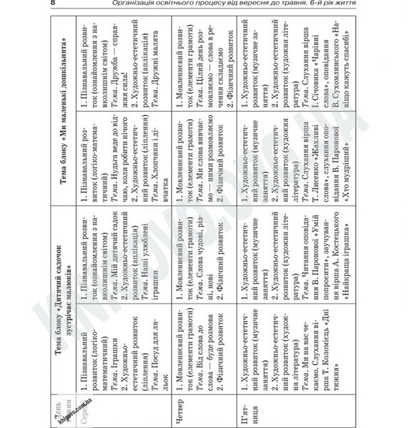 Посібник містить орієнтовне планування організації життєдіяльності дітей у групі шостого року життя за блочно-тематичним принципом. Наведено перспективне планування на весь навчальний рік та планування занять з фізичного, мовленнєвого, пізнавального, художньо-естетичного розвитку дітей. Також уміщено циклограми трудової, ігрової, дослідно-експериментальної діяльності дітей і циклограми спостережень на навчальний рік, на основі яких складаються календарні плани. Розроблені підходи до планування є універсальними, відповідають змісту Базового компонента дошкільної освіти та вимогам чинних програм.