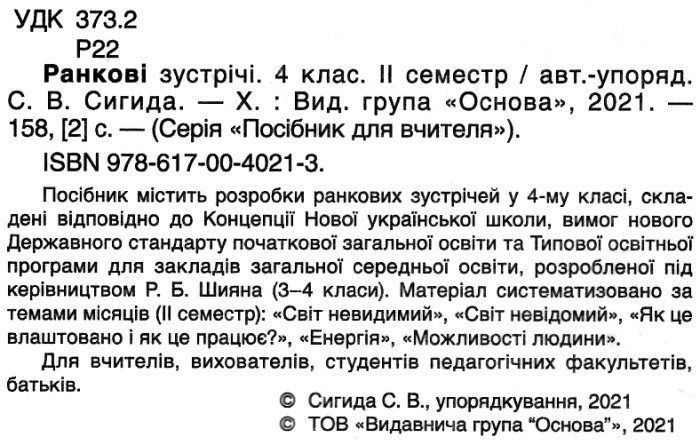 Посібник для вчителя Ранкові зустрічі 4 клас ІI семестр НУШ Основа Нова українська школа. Посібник містить розробки ранкових зустрічей у 4-му класі, складені відповідно до Концепції Нової української школи, вимог нового Державного стандарту початкової загальної освіти та Типової освітньої програми для закладів загальної середньої освіти, розробленої під керівництвом Р. Б. Шияна (3-4 класи).