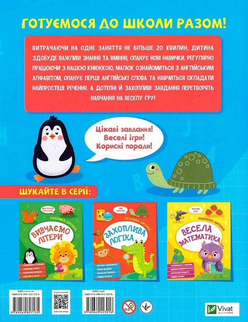 Витрачаючи на одне заняття не більше 20 хвилин, дитина здобуде ВАЖЛИВІ знання та вміння, опанує нові навички. Регулярно працюючи з нашою книжкою, малюк ознайомиться з англійським алфавітом, опанує перші англійські слова та навчиться складати найпростіші речення. А дотепні й захопливі завдання перетворять навчання на веселу гру!