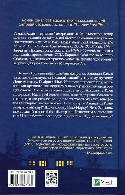 Про автора:Румаан Алам — сучасний американський письменник, автор кількох романів-сенсацій, які дістали схвальні відгуки від престижних The New York Times, New York Magazine, The New Yorker, The New York Review of Books, Bookforum і New Republic. Продюсерська компанія Higher Ground, заснована колишнім президентом США Бараком Обамою та Мішель Обамою, підписала контракт із Netflix на екранізацію роману за участі Джулії Робертс та Махершали Алі.