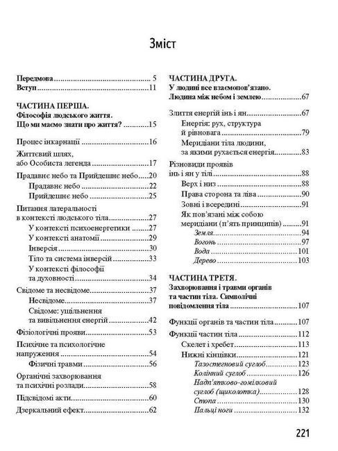 Психічні процеси впливають і на фізичний стан організму. Ось чому причиною раптового болю в коліні може бути не просто вивих, а негаразди у ваших стосунках з близькими, а алергія, раптова температура, запалення, пухлини можуть повідомляти про щось значно більше. Автор цієї книжки спробує вам ці повідомлення розшифрувати. Вивчаючи східну медицину протягом понад 20 років, Мішель Одуль зрозумів: наше тіло справді сигналізує про проблеми, і доказом цього є зв’язок між емоційним та психічним напруженням і конкретними захворюваннями. Розв’язуючи власні проблеми, ми можемо подолати будь-який біль, повернути здоров’я та віднайти щастя в житті.