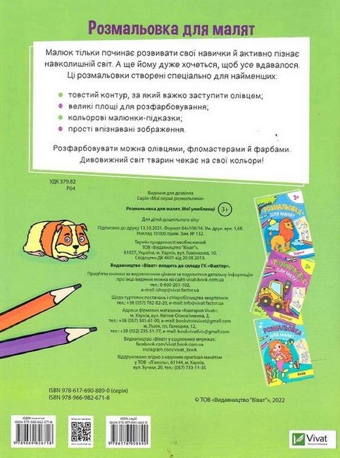 Малюк тільки починає розвивати свої навички й активно пізнає навколишній світ. А ще йому дуже хочеться, щоб усе вдавалося. Ці розмальовки створені спеціально для найменших: