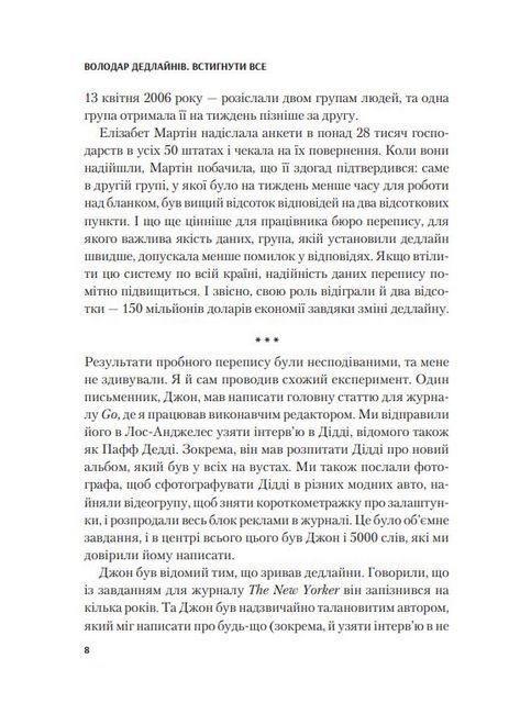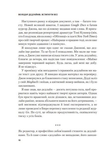 Визначте дедлайн на купівлю й прочитання цієї книжки, щоб не запізнитися до ресторану, який відкривають без стресів і паніки, на власні очі побачити рукотворне засніження гори та як сходить із конвеєра пасажирський літак. Ви дізнаєтеся, як доставляють великодні лілії, і побуваєте за лаштунками театру перед прем’єрою. Потрапите в ескадрилью військово-повітряних сил, що рятуватиме постраждалих від урагану, і в крамницю Best Buy напередодні чорної п’ятниці. Поспостерігаєте за засновниками стартапу, що представляють свій продукт громадськості, візьмете участь у передвиборчій кампанії. Опанована наука, як установлювати та обнуляти власний таймер, створюватиме простір для всіх ваших справ. Простір, у якому, на щастя, є час для завершення роботи, час для роздумів і час на відпочинок.Про автора: