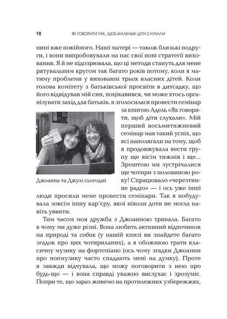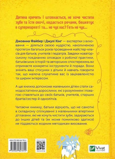 Джоанна Файбер і Джулі Кінґ — експертки з виховання — діляться своєю мудрістю, накопиченою протягом багатьох років проведення майстер-класів для батьків, учителів і педіатрів. Завдяки новаторському поєднанню оповідок з робочої практики, батьківських історій та авторських спостережень ви отримаєте конкретні інструменти й поради. Вони змінять ваші стосунки з дітьми й навчать говорити так, що малеча слухатиме вас із зацікавленістю та щирим інтересом.