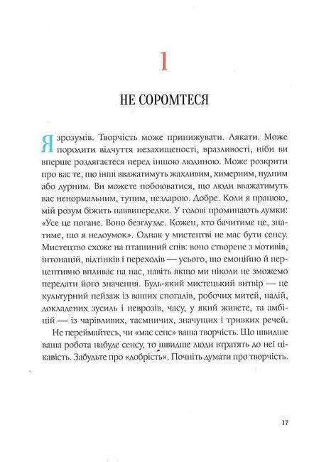 Багато хто мріє стати митцем. Але як цього досягти? Навіть легендарні творці на початку свого шляху не знали, як себе зарекомендувати, де брати креативні ідеї, як увійти до кола митців, навчитися сприймати критику та осмислювати свою роль у суспільстві. Автор цієї книжки пропонує слушні поради тим, хто має творчий запал. Ці неочевидні правила, конструктивні підказки й поради допоможуть розкрити власний потенціал, навчитися максимально використовувати сильні боки свого матеріалу, розв’язувати професійні проблеми і — найголовніше — діставати задоволення від творчості.