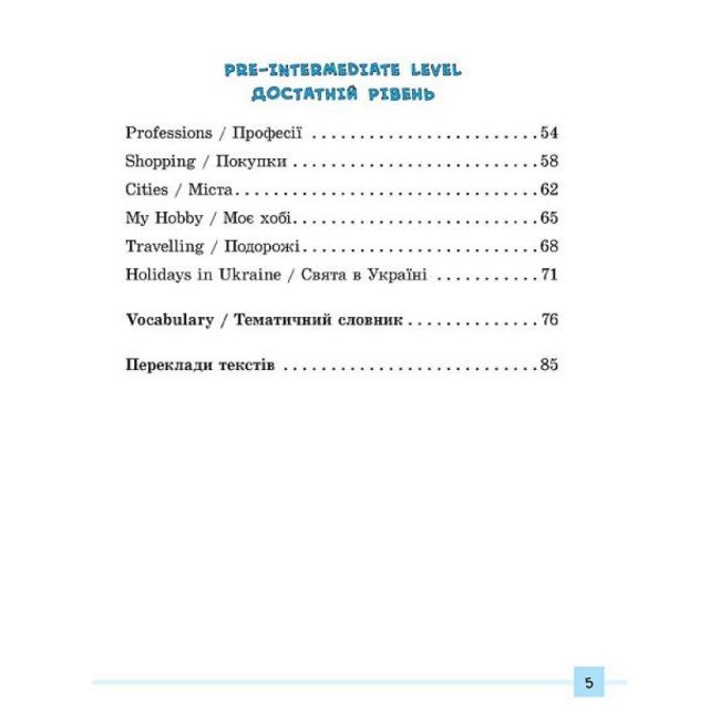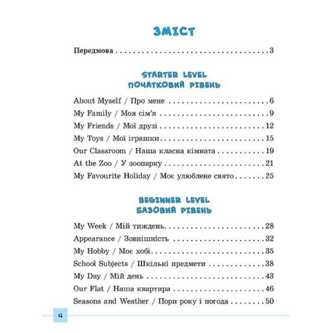 Посібник з Англійської мови містить не тільки розмовні теми з дослівним перекладом, а й цікаві завдання, зразки усних відповідей і тематичний словник. Тексти складені в межах лексичного і граматичного матеріалу відповідно до чинної програми з іноземної мови МОН України для початкової школи. Чітко структурований за трьома рівнями складності посібник дає змогу ефективно підготуватися до аудіювання, словникових диктантів, контрольних і самостійних робіт, поглибити знання, закріпити комунікативні навички за допомогою вправ різних типів.