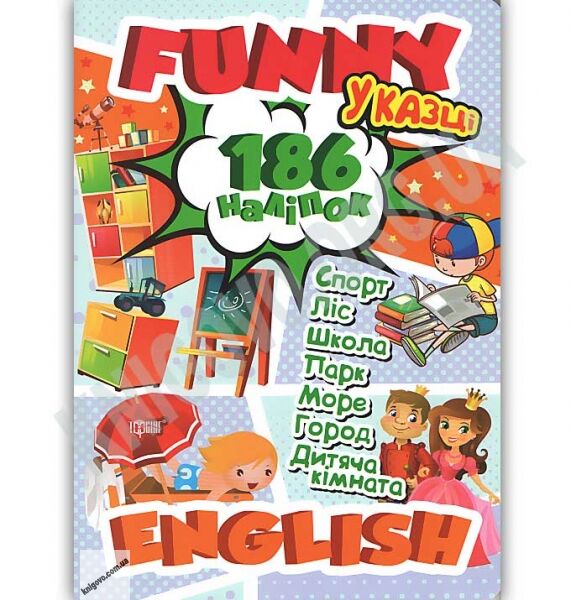 Funny english У казці 186 наліпок. Англійська мова це дивовижна картина всесвіту, відмінна від нашої. І її можна цілком побачити лише завдяки великому лексичному запасу. Цей тренажер з англійської мови дозволить легко вивчити нові слова, просто читаючи їх українською мовою.