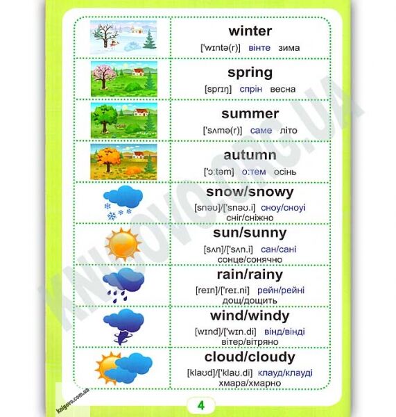 У кожній темі ви знайдете: 9 основних слів з малюнками-підказками, вимову англійських слів транскрипція, транслітерація, прості словосполучення, яскраві веселі малюнки