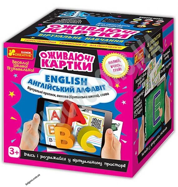 Оживаючі картки Англійський алфавіт Літери і слова. Доповнена реальність - дивовижна надсучасна технологія, яка за допомогою смартфона чи планшета поєднує віртуальний і реальний світи та дає можливість взаємодіяти з ними. Поринь у віртуальний світ захоплюючих пригод!