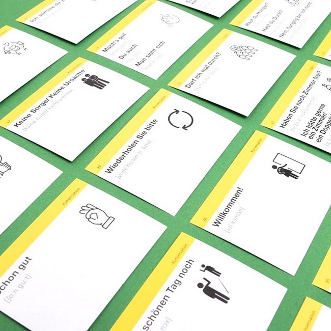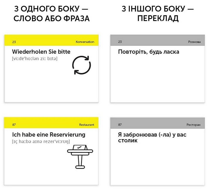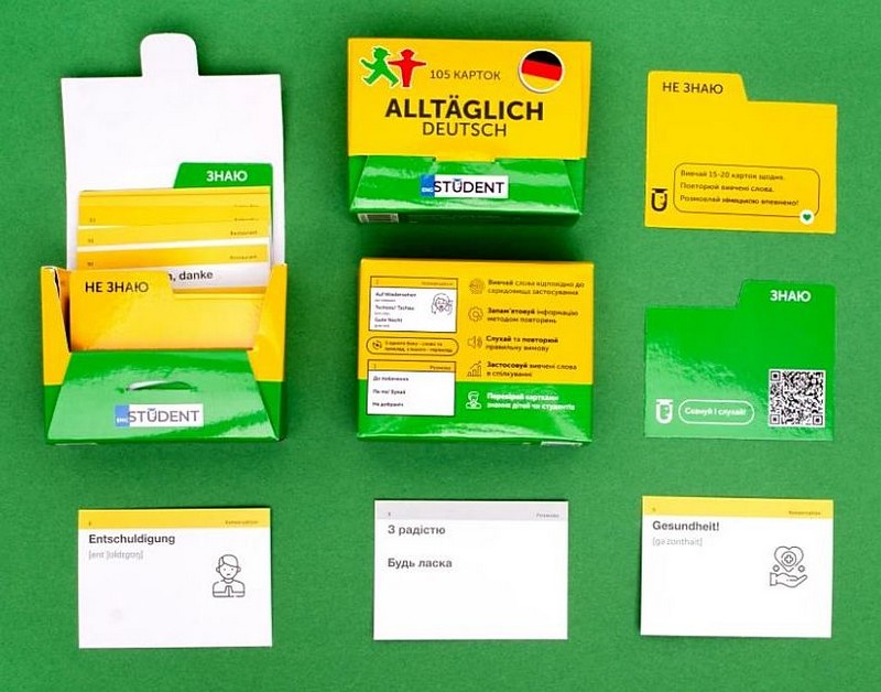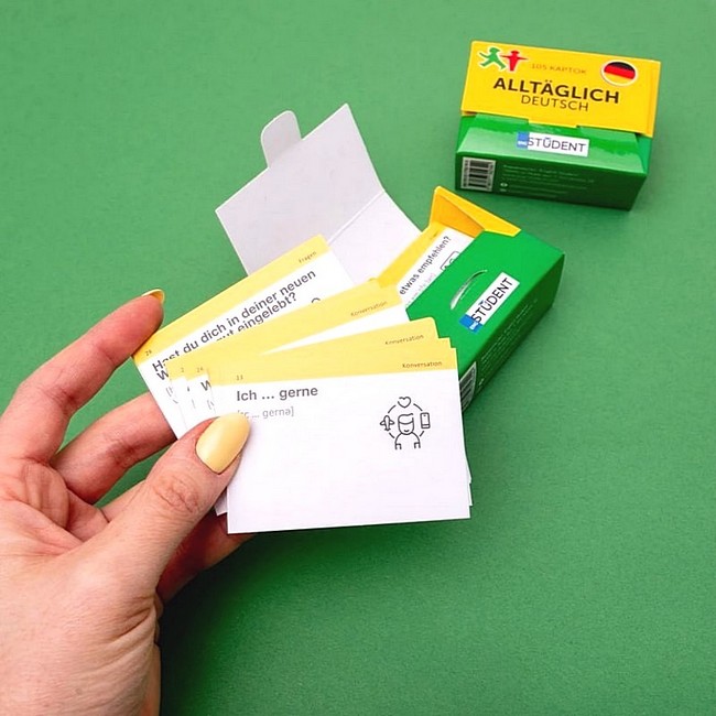 Набір «Alltaglich Deutsch» (рівень А1-А2) — картки із фразами на щодень для підвищення рівня володіння німецькою. Для тих, хто починає вчити німецьку, але вже хоче вміти вести елементарну розмову. 105 карток із запитаннями та популярними виразами допоможуть почуватися впевненіше під час буденної розмови та подорожі за кордон. До кожної картки набору є аудіосупровід, який додатково навчить розбиратися з правильною вимовою та сприйманням слів на слух.