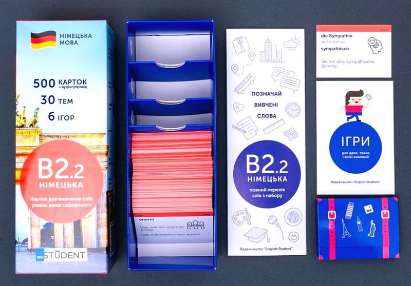 Кожен набір містить: 500 карток, коробку для інтервального повторення, дорожній футляр, QR-код з аудіосупроводом та збірку ігор.