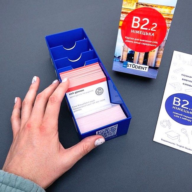 Німецька В2.2 — друга частина вище середнього рівня. Цього достатньо, щоб вільно спілкуватися з носіями мови в різних ситуаціях. Для тих, хто не зупиняється на досягнутому. В цьому наборі 708 німецьких слів та 560 прикладів їх вживання.