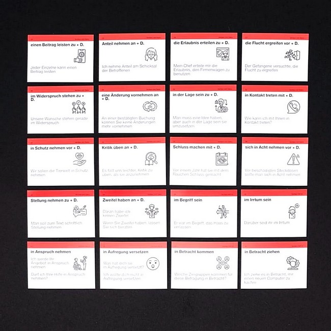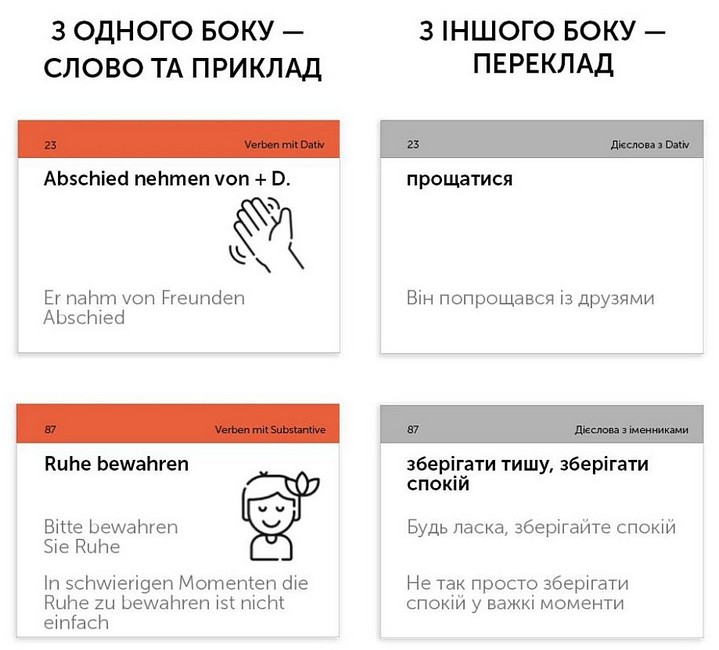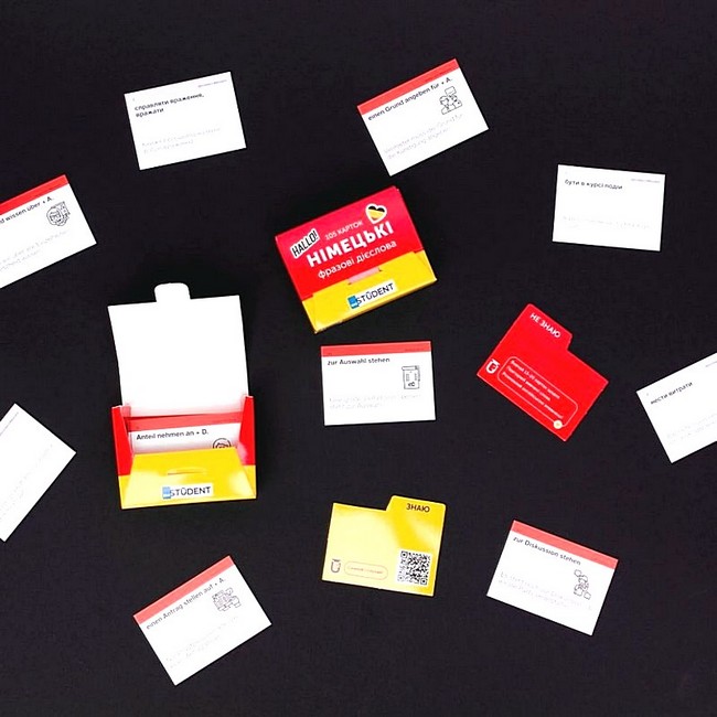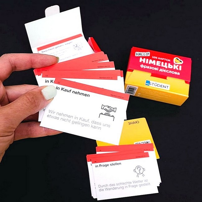 Набір «Німецькі дієслова» (рівень А2-В2) — картки для підвищення рівня володіння німецькою. Знання дієслів керування допоможе урізноманітнити неформальне спілкування та краще розуміти носіїв мови, адже вони користуються ними повсякчас. До кожної картки є аудіосупровід, який ще й навчить правильно чути та вимовляти слова та фрази. Набір призначений для тих, хто вже має базові знання з німецької, але хоче рухатися далі й почуватися впевненіше під час спілкування з іноземцями.