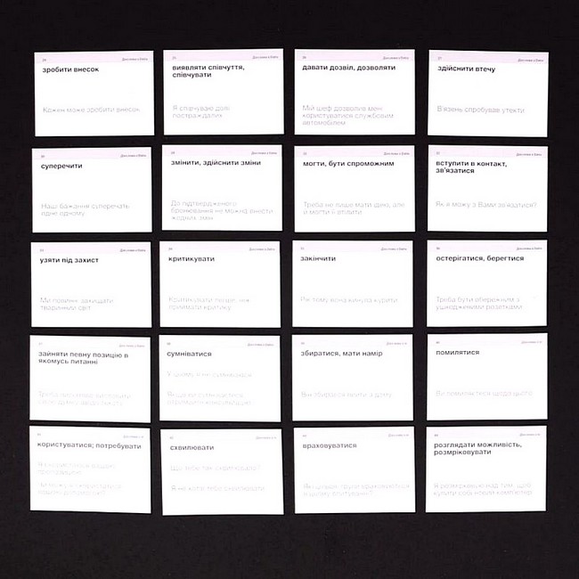 Кожен набір містить: 105 карток, два розділювачі «Знаю» та «Не знаю», спрощену версію коробки для інтервального повторення, QR-код з аудіосупроводом.