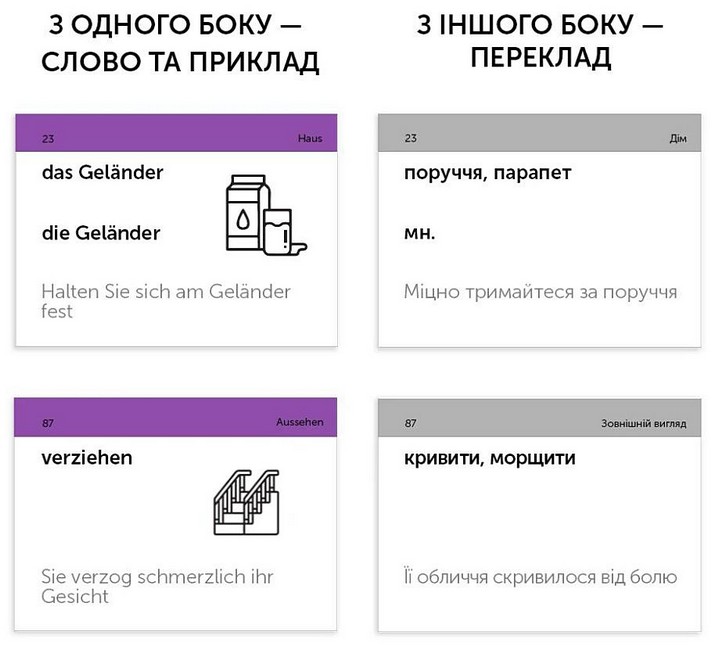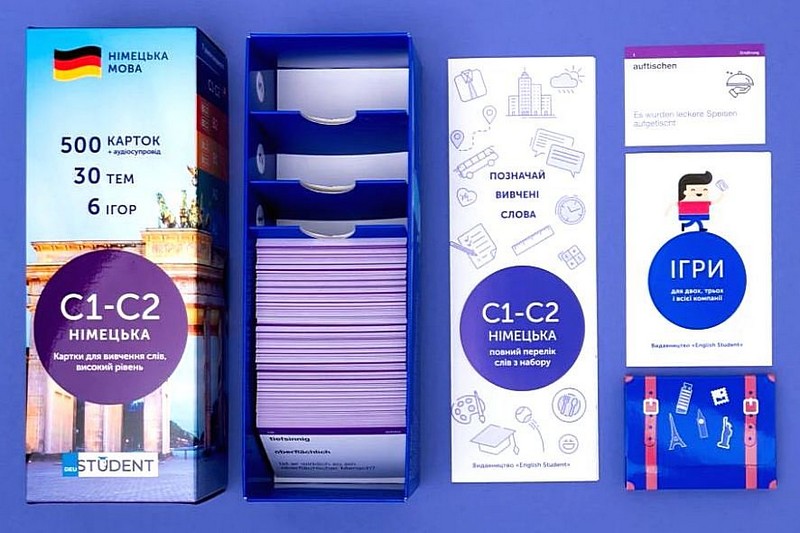 Кожен набір містить: 500 карток, коробку для інтервального повторення, дорожній футляр, QR-код з аудіосупроводом та збірку ігор.