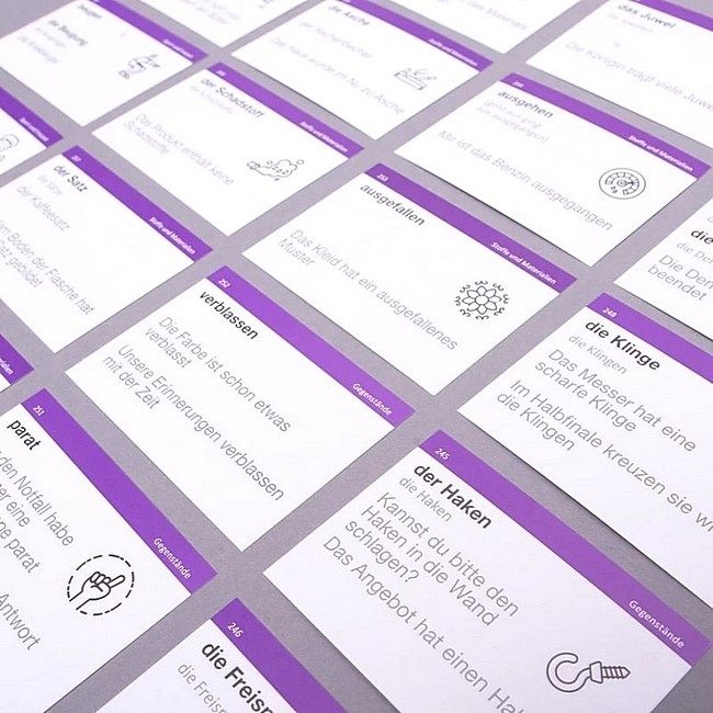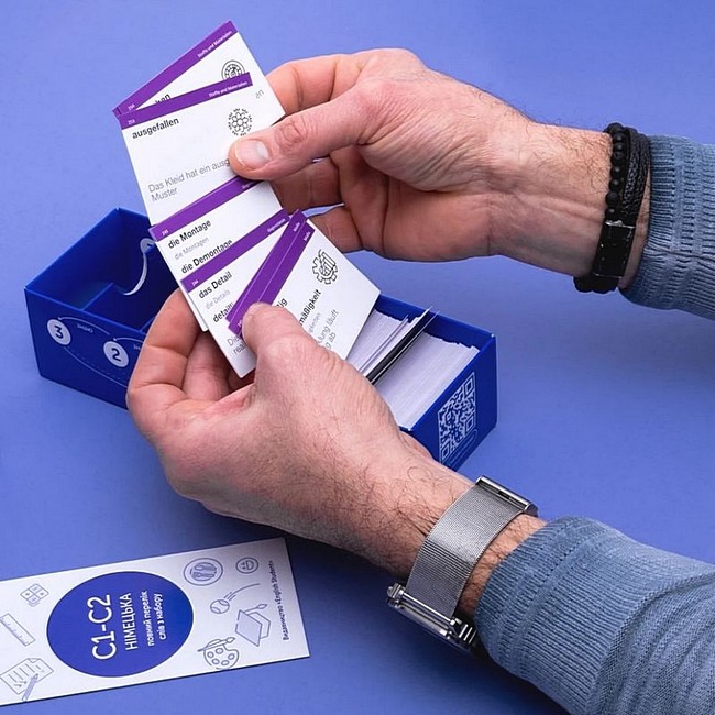 Картки для вивчення німецької на рівні С1-С2 — це просунутий набір для тих, кого не лякають довгі слова типу (der) Sommerschlussverkauf. Підійде тим, хто хоче володіти німецькою на рівні справжнього німця та стати muttersprachler. Картки допоможуть описувати з неймовірною точністю свої емоції, навколишній світ та вільно підтримувати будь-яку розмову німецькою. У цьому наборі 1048 слів та 553 приклади їх вживання.