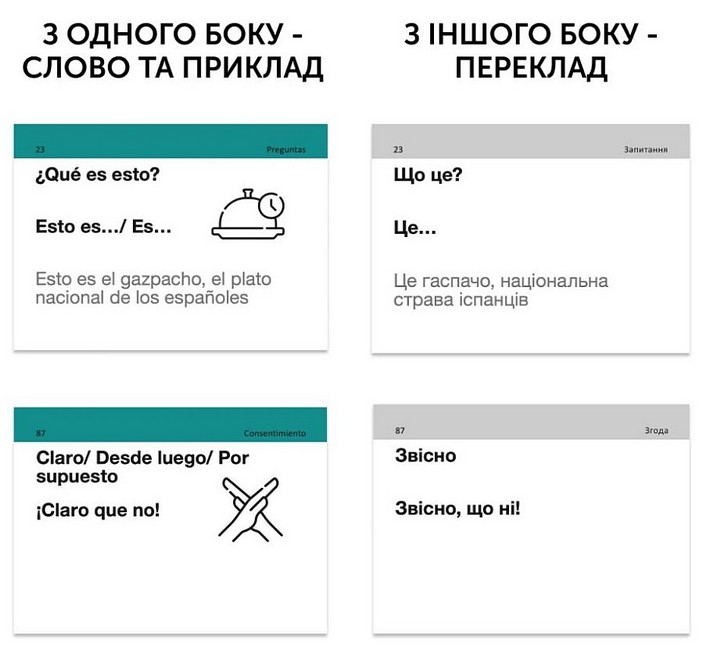 Набір «Іспанська на щодень» (рівень А1-А2) — картки із фразами на щодень для підвищення рівня володіння іспанською. Для тих, хто починає вчити іспанську, але вже хоче вміти вести елементарну розмову. 105 карток із запитаннями та популярними виразами допоможуть почуватися впевненіше під час буденної розмови та подорожі за кордон. До кожної картки набору є аудіосупровід, який додатково навчить розбиратися з правильною вимовою та сприйманням слів на слух.