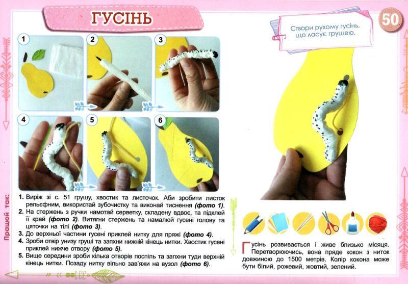 У цьому виданні: вишивання на картоні, аплікації з ниток, природних матеріалів, паперу (гофрованого, скрученого, рваного), композиції з пластиліну, декорування, нескладні оригамі, вироби в техніці квілінгу, намотування нитки, робота в техніці пап’є-маше, бісероплетіння, пальчикові іграшки, витинання, вироби з котасиків (помпончиків), конструювання з підручних матеріалів, виготовлення панно, робота в техніках торцювання, декупажу, шиття персонажів театру ляльок тощо.