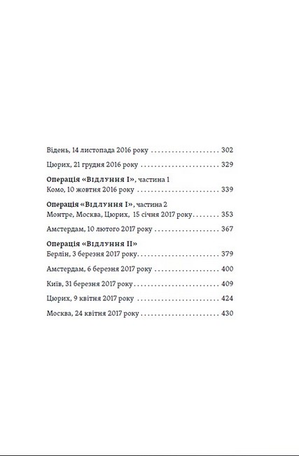 Автор виокремлює розповідь про операцію «Відлуння», частина якої відбувалася в Україні, розповідаючи читачам про те, як міжнародна група офіцерів розвідки здійснила адекватну відповідь на експансію Кремля.
