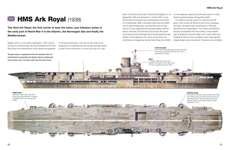 Під час Другої світової війни авіаносець остаточно вступив у свої права. Авіаносці, що мали на борту 30–40 літаків, дозволили ВМС Японії та США розгорнути повітряну міць у величезному Тихому океані, а японський рейд на Перл-Гарбор передвіщав новий вид війни. З потопленням сотень кораблів під час Другої світової війни, включно з німецьким лінкором «Бісмарк» у 1941 році, до кінця війни авіаносці панували над хвилями, і ера лінкорів минула. Авіаносці представляють плоский верх і штурмові кораблі за останні 100 років, від USS Yorktown, який пережив прямі влучення під час битви за Мідвей (1942), через ветерана Фолклендської війни HMS Invincible і до могутнього класу Nimitz, ядра корабля. Сьогодні авіаносні бойові групи ВМС США. Також включені значні десантні кораблі, такі як USS Tarawa та французький Mistral. Кожен запис містить короткий опис розробки та історії корабля, колірний профіль або розріз, основні характеристики та технічні характеристики.
