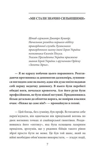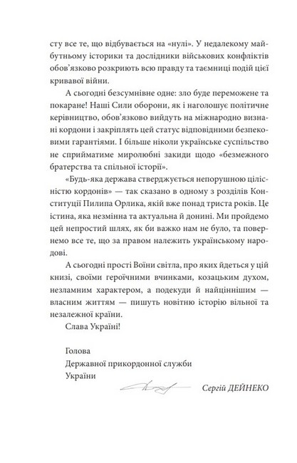 У книзі зібрані воєнні історії військовослужбовців прикордонних загонів, спецпризначенців окремого мобільного прикордонного загону, Морської охорони, медично-евакуаційних груп, медиків мобільних госпіталів, тих, хто ризикує своїми життями задля здобуття Перемоги України на полі бою.