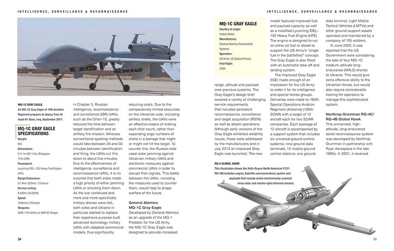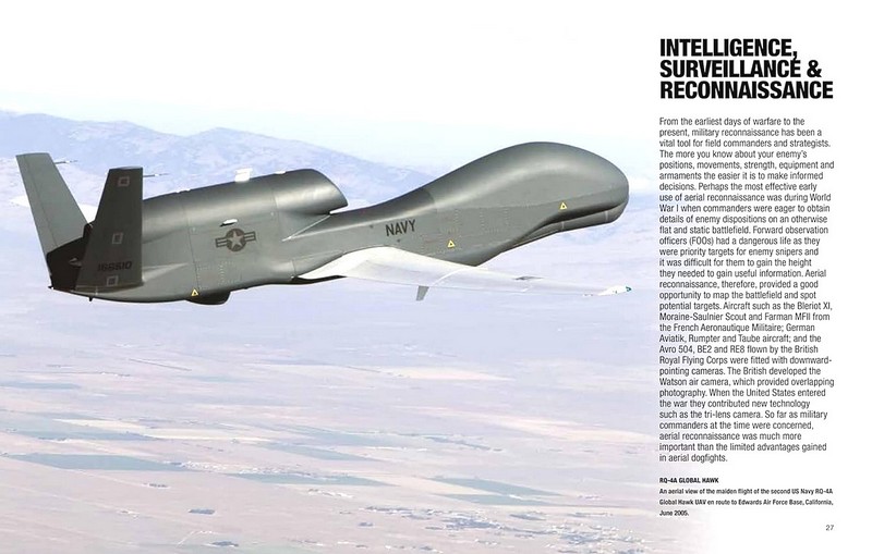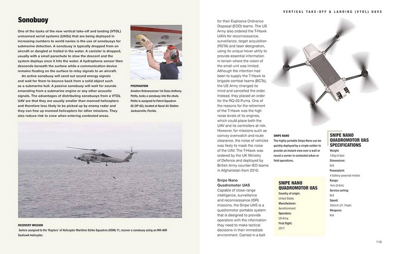 За останні 20 років роль безпілотних авіаційних систем у сучасній війні зросла безпрецедентними темпами. Безпілотники більше не використовуються просто для розвідки, збору даних або розвідки, вони зазвичай використовуються для захоплення цілей і для ударів по ворожих цілях за допомогою ракет і бомб. Military Drones надає детальне уявлення про спеціальні військові безпілотні літальні апарати, які відіграють ключову роль у сучасному бойовому просторі. До них належать класичні моделі, такі як MQ-1 Predator, який в основному використовується для збору розвідданих; Black Hornet Nano, мікро-БПЛА, який настільки малий, що може поміститися у вашій долоні, і використовується сухопутними військами для визначення місцевої ситуації; китайський трикоптер Scorpion, який ідеально підходить для стаціонарного спостереження та ударної ролі в населених пунктах; і французький EADS Talarion, двореактивний БПЛА тривалої роботи, призначений для спостереження на великих висотах.