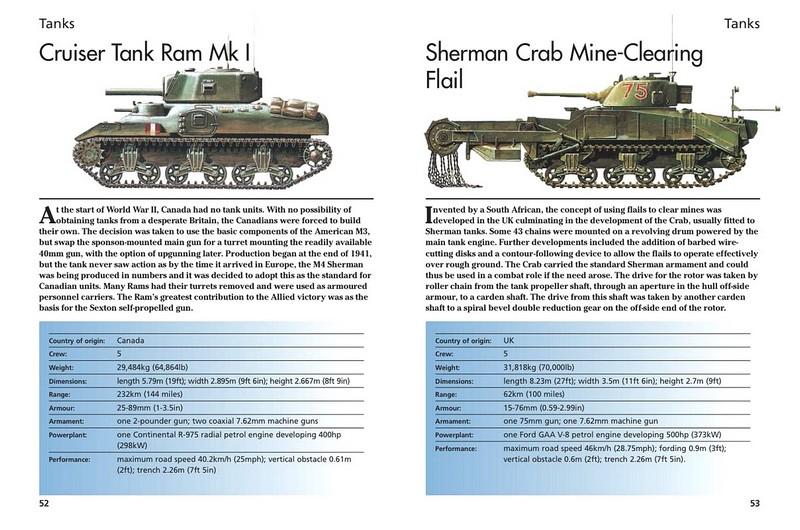 Від грубих, ненадійних танків, які вперше з’явилися на Західному фронті під час Першої світової війни, до сучасних високотехнологічних машин, у «Танках і військових машинах» представлено 300 найважливіших і найвпливовіших танків і БТР з 1916 року до наших днів. На сторінці кожного запису кожна машина проілюстрована повнокольоровим малюнком бокового профілю та супроводжується детальною таблицею специфікацій із зазначенням країни походження, екіпажу, ваги, розмірів, броні, озброєння, силової установки та продуктивності, усі вимірювання в імперська та метрична. Крім того, для кожного транспортного засобу є супровідний текст, який підсумовує історію розробки та обслуговування автомобіля. Упорядковані за типами від основних бойових танків до винищувачів танків і броньованих автомобілів, машин-амфібій і зенітних установок, танки та військові машини варіюються від Mark V Male до Tiger, Sherman і T-34 і до M1 Abrams, Challenger. і Воїн сьогодення. Книга «Танки та військові транспортні засоби», представлена в зручному форматі кишенькової книжки, є барвистою, насиченою інформацією та дає чудове уявлення про розвиток сухопутної війни за останнє століття.