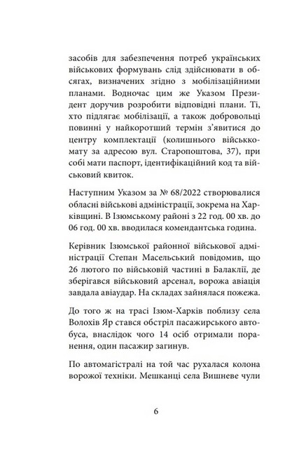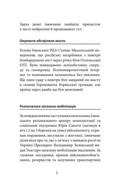 Автор, професійний журналіст, створив хроніку окупації Ізюму 2022 року. Рядок за рядком розгортається реальна історія міста та його мешканців. Читач дізнається про дії місцевої влади у час воєнного стану, проблеми забезпечення життєдіяльності міста, які почалися з перших днів повномасштабного вторгнення, про трагедії людей. Росіяни не могли захопити Ізюм протягом трьох тижнів, що дало нашим військовим час підготувати фортифікаційні оборонні споруди на Схід і на Південний Схід від міста. Після звільнення Ізюму у вересні 2022 року тут знайшли масові поховання і чисельні катівні, які облаштували окупанти. Близько 80% житла в місті було зруйновано.