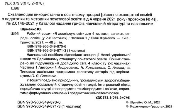 У нашому інтернет-магазині ви можете придбати робочий зошит "Я досліджую світ" для 4 класу НУШ, призначений для використання разом з підручником Андрусенко І. та Шумейко Ю. "Грамота". Цей зошит містить завдання для закріплення матеріалу та розвитку пізнавальних здібностей учнів з тем, що вивчаються в 1 частині підручника.