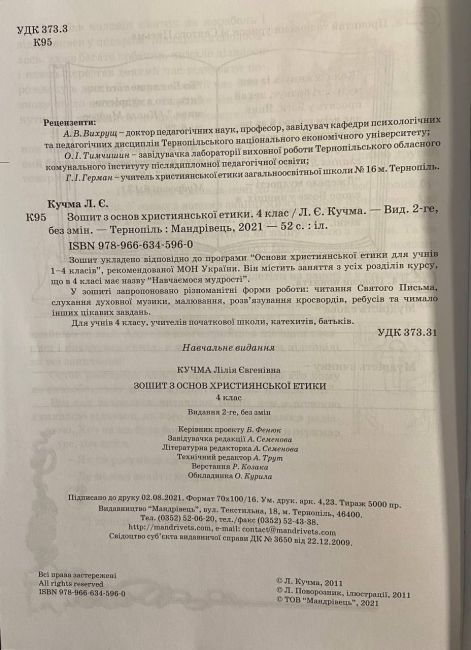 Зошит з основ християнської етики 4 клас Кучма Л. Мандрівець. Зошит укладено відповідно до програми “Основи християнської етики для учнів 1–4 класів”, рекомендованої МОН України (лист № 1/11-6347 від 13.07.2010 р.). Він містить заняття з усіх розділів курсу, що в 4 класі має назву “Навчаємося мудрості”. У зошиті запропоновано різноманітні форми роботи: читання Святого Письма, слухання духовної музики, малювання, розв’язування кросвордів, ребусів та чимало інших цікавих завдань. Для учнів 4 класу, учителів початкової школи, катехитів, батьків.
