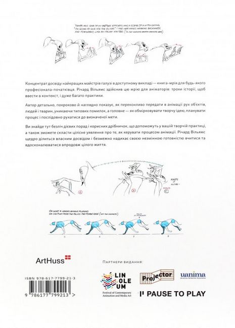 Концентрат досвіду найкращих майстрів галузі в доступному викладі — книга-мрія для будь-якого професіонала-початківця. Річард Вільямс здійснив цю мрію для аніматорів: трохи історії, щоб ввести вас у контекст, і багато-багато-дуже багато практики. Автор детально, покроково й наглядно показує, як переконливо передати в анімації рух об’єктів, людей і тварин, уникаючи типових помилок; ви знайдете тут безліч дієвих порад і корисних дрібничок, що допоможуть у вашій творчій практиці, а також зможете скласти цілісне уявлення про те, як керувати процесом анімації. Річард Вільямс щедро ділиться власним досвідом і безмежно надихає своєю незмінною готовністю вчитися й удосконалюватися впродовж цілого життя.