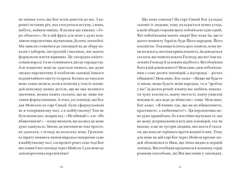 \nУ повсякденні ми часто знаходимо шляхи, щоб обійти Його заповіді, а ще часто прагнемо домовитися із Богом про умови їхнього дотримання. Саме так відбувається, якщо сприймати Декалог як перелік незручних настанов, що вимагають зусиль і жертв, а не як дороговказ до ціннішого життя. Окрім буквального значення Божих заповідей, Адам Шустак заохочує нас ретельніше поглянути на них і в такий спосіб довіритися Богу, Який завжди прагне блага для своїх дітей.
