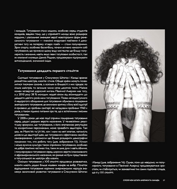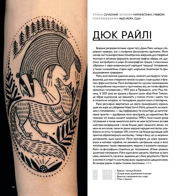 Перед вами ілюстроване дослідження розмаїття стилів і найвидатніших майстрів татуювання від давніх часів до сьогодення. Мистецтво та практика татуювання зазнали радикальних змін у 21 столітті, оскільки його популярність стрімко зросла. Дедалі більше тату-майстрів відшуковують втрачені традиції й водночас впроваджують інновації у своїй роботі. З'явилося величезне розмаїття стилів, жанрів і технік: від геометричного блекворку до яскравих, живописних стилів, від ручного татуювання до машинних малюнків.