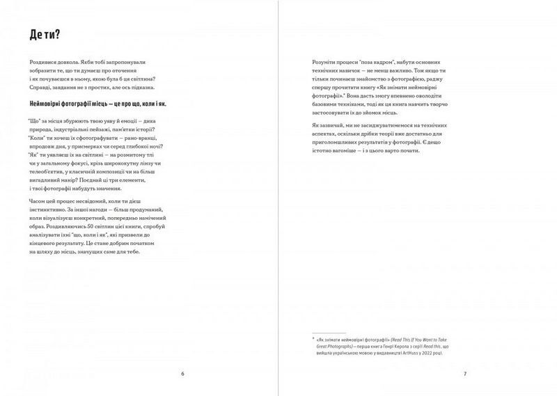 Модель вашої камери, інтереси чи рівень навичок не мають значення — Генрі Керол розповість про всі необхідні прийоми та розбере до дрібниць роботу відомих фотографів. У книзі ви знайдете підбірку визнаних фотошедеврів, а також практичні поради, що допоможуть вам швидко навчитися знімати улюблені місця.Про автора: