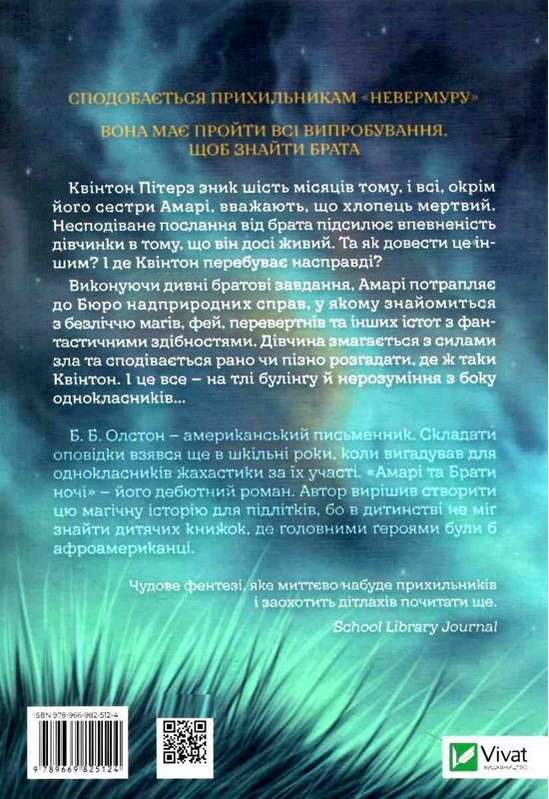 Амарі та Брати ночі Олстон Б. Віват. Фантастичний світ магів фей та перевертнів. Квінтон Пітерз зник шість місяців тому, і всі, окрім його сестри Амарі, вважають, що хлопець мертвий. Несподіване послання від брата підсилює впевненість дівчинки в тому, що він досі живий.