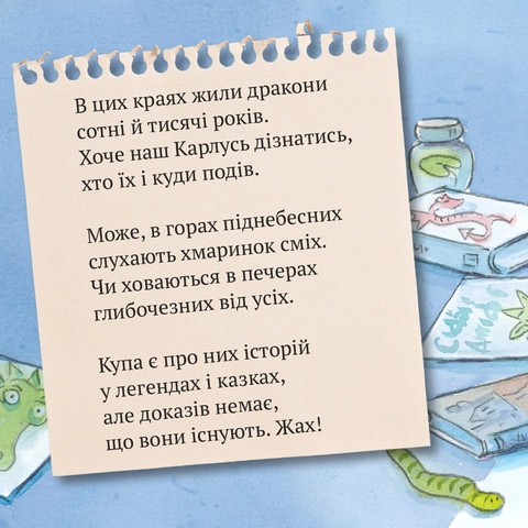 Віршована історія про Карлуся, який береться шукати сліди драконів.