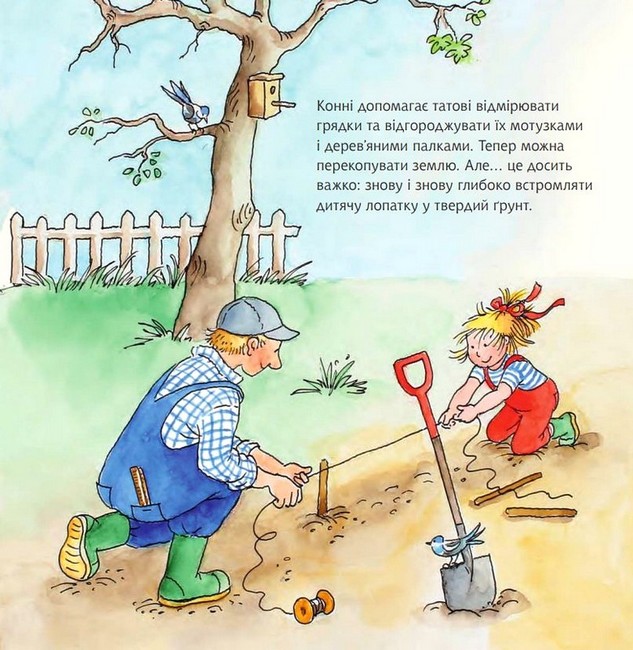 Конні тішиться, адже наступні вихідні вони з татом проведуть лише удвох. Вони вирішили облаштувати сад. Це має бути сюрпризом для мами. Конні з татом малюють план саду, копають землю, вибирають рослини, а також лагодять велосипедні шини… Вони – справжня команда!