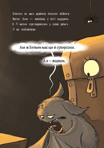 Вінсент зажурився. Навіть подружки Поллі та Фрітці не можуть його розрадилити. От чого Фрітці може обертатись у повню на круту морську перевернинку, а він ні? Кажан дуже хотів би мати якусь СУПЕРСИЛУ, аби нагнати тій лихій кішці добрячого страху! Інші тварини-напівпривиди могли б дати йому кілька порад. А де ж іще їх шукати, як не в зоопарку? Проте виявилося, що вночі там значно моторошніше…