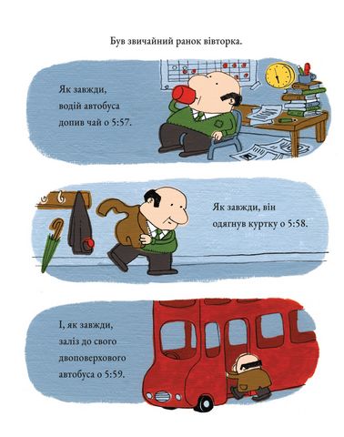 Всі на борт для дивовижної пригоди! Щодня водій автобуса допиває чашку чаю, одягає куртку і вирушає в дорогу. Щодня чоловік у великій червоній краватці заходить на кільцевій розв’язці, дама з візком заходить біля бібліотеки, а галасливі діти заходять на Кловер-Драйв. Але що, коли одного разу водій поверне на нову дорогу та візьме на борт нових людей?