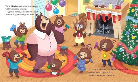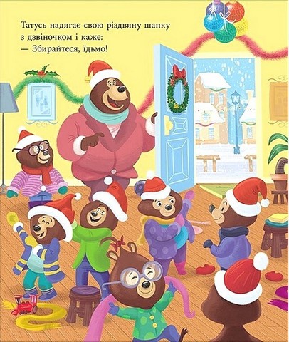 Історія французької письменниці Карін-Марі Амйо про теплі родинні стосунки тата-ведмедя і його ведмежат. Татусь Цілуйко і сім ведмежат з нетерпінням чекають на Різдво. Вони зустрічають на ринковій площі Санта-Клауса, співають колядки, прикрашають ялинку й складають списки подарунків… А що ж отримає тато-ведмідь на Різдво? Про який подарунок він мріє? Як же непросто бути татом, але це таке щастя! Книга для дітей дошкільного віку.
