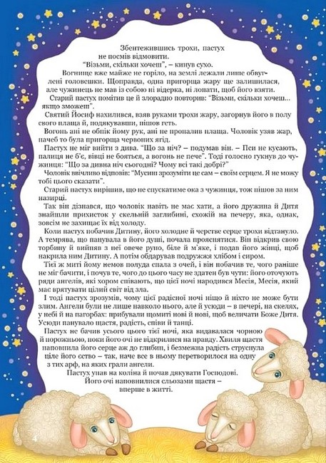 Сім чудових історій для наймолодших читачів від відомого священника-письменника отця Бруно Ферреро. Сім розповідей, які налаштують малюків та їхніх батьків на хвилю різдвяного настрою. Сім легенд про народження, любов, істину, добро, віру і дружбу, які допоможуть батькам у вихованні дітей, а дітям розкажуть про чудовий момент Народження Христа.