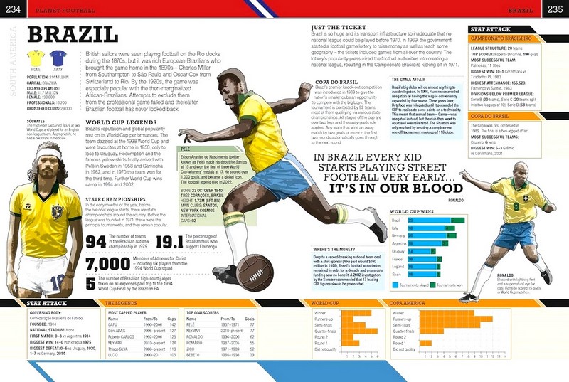 - Stats and fact boxes profile players, managers, fans, national teams, and club.