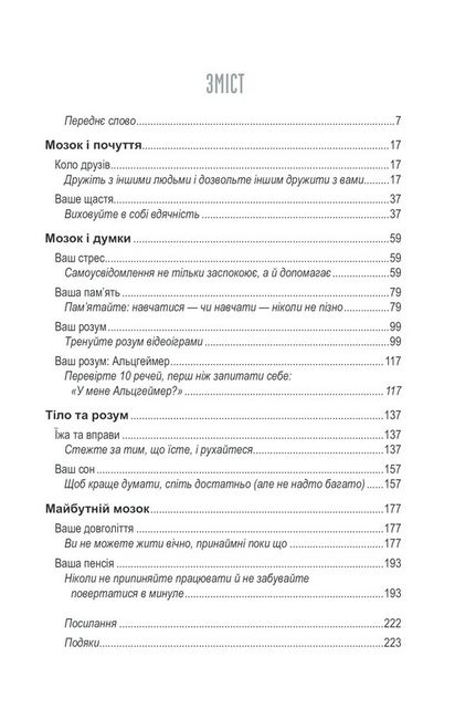 Ви дізнаєтеся: як покращити свою пам’ять; чому варто зустрічатися з друзями; навіщо ходити на танці якомога частіше; чому читання книжок по кілька годин на день може продовжити життя на кілька років. З’ясуєте, що вивчення нової мови — найкраща вправа для розуму, особливо якщо вас хвилює деменція; що регулярна участь у дружніх суперечках — неначе щоденні вітаміни для мозку, а деякі відеоігри справді можуть покращити вашу здатність долати проблеми.