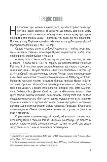 Можливо, це вас засмутить, але магічного еліксиру вічної молодості не існує. Проте, коли йдеться про причини старіння, поступове зношування краще, ніж фатальна поломка. Однак не варто вважати неминучим згасання сили мозку з плином років. Якщо ви дотримуватиметеся викладених у цій книжці порад, ваш мозок буде пластичним, відкритим до навчання, досліджень і нових знань у будь-якому віці, без деменції, хвороб Альцгеймера чи Крона.