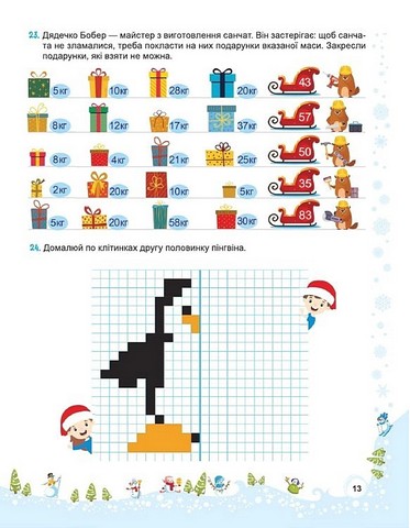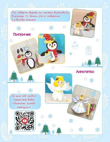 «Сніговичок» — це зошит, що поєднує зимовий відпочинок з інтелектуальним розвитком та атмосферою різдвяно-новорічних свят. Він містить різноманітні завдання, кросворди, розмальовки, лабіринти, а також вкладку з простими у виготовленні саморобами. На форзацах є фото готових виробів, різдвяна розмальовка та QR-код до відео «Безпечні зимові канікули» і фото готових виробів.